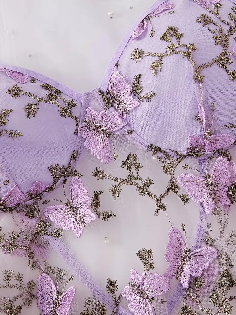 Su diseño incluye un bralette con copas suaves y un panty tipo hilo, confeccionados en malla ligera y bordado de mariposas que parecen flotar sobre la piel ✨