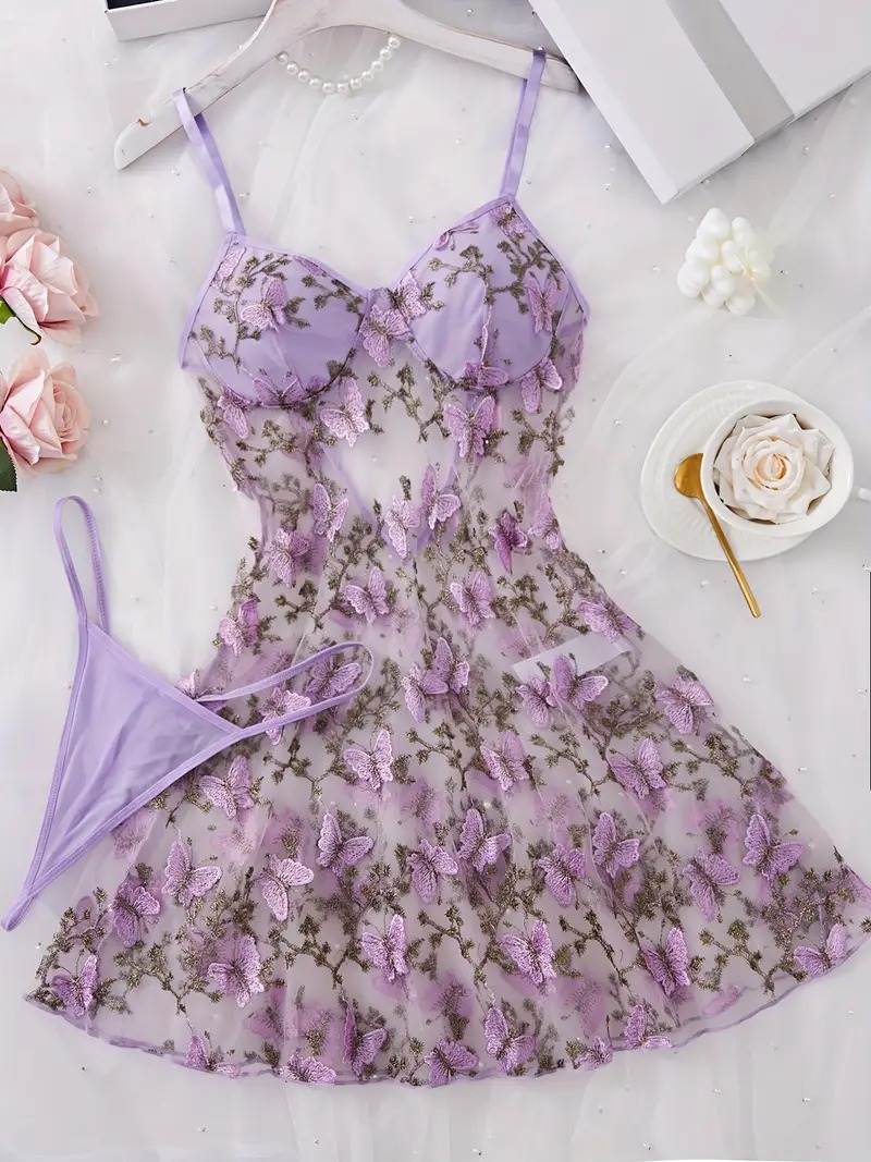 Un conjunto tan sutil como elegante. Este camisón transparente con detalles bordados en tonos lavanda y lilas combina femineidad, frescura y un toque romántico.