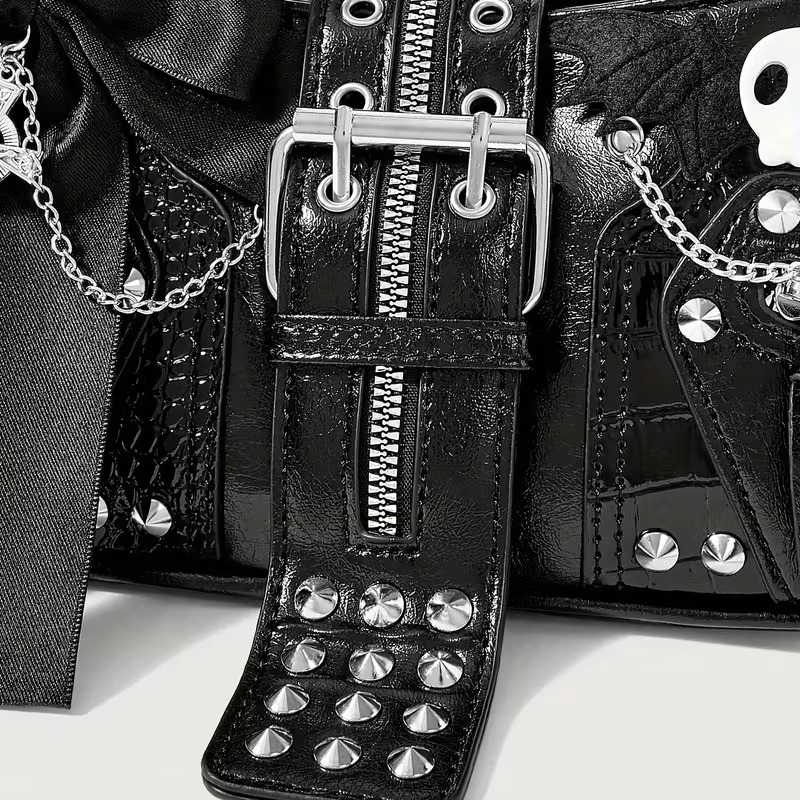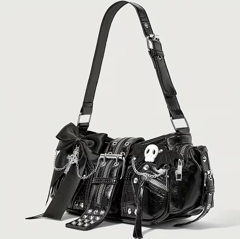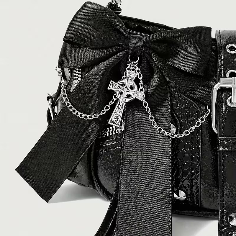 VN1174 Bolso de Mano Y2K Negro Cuero Sintético con Lazo